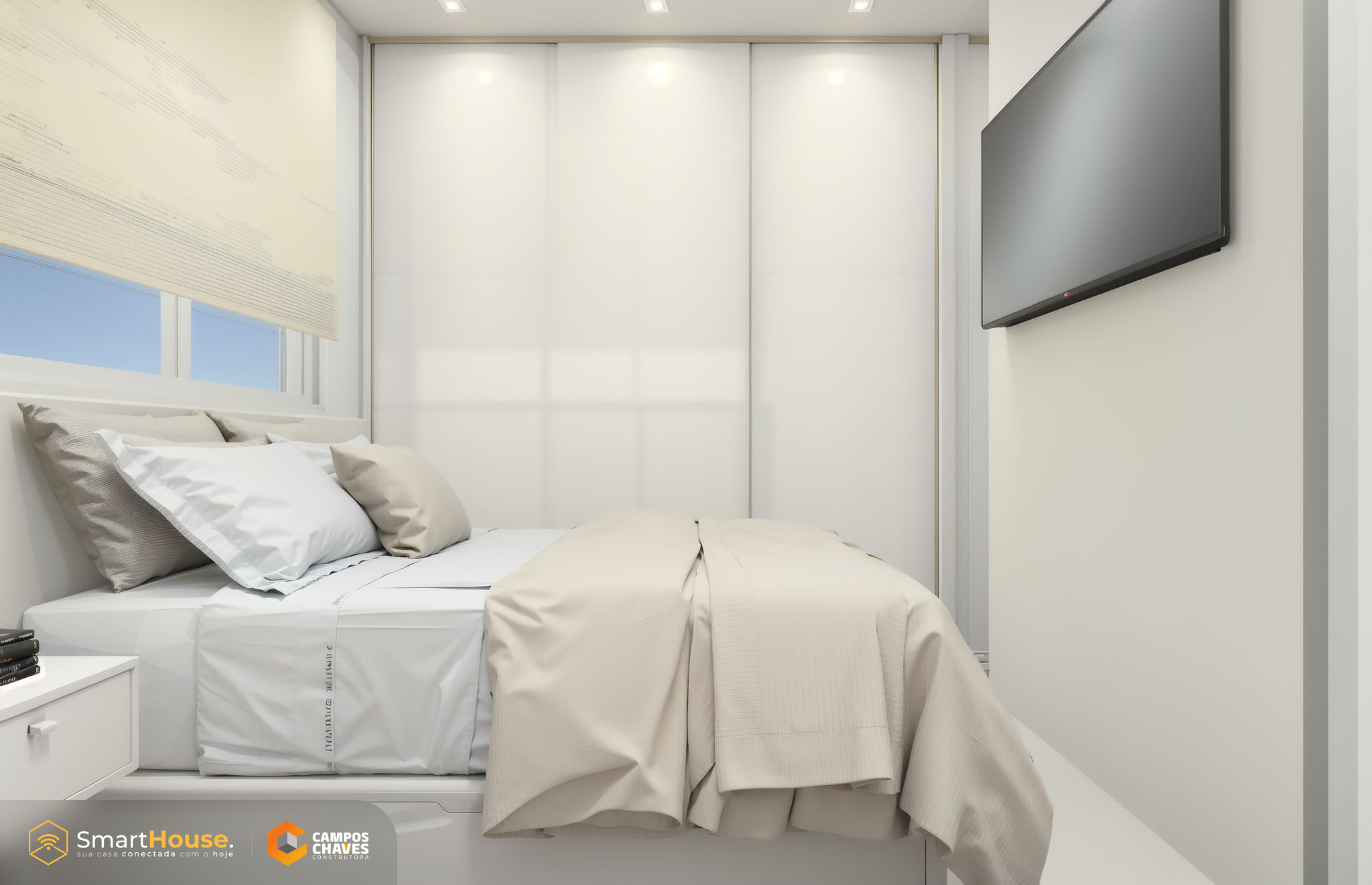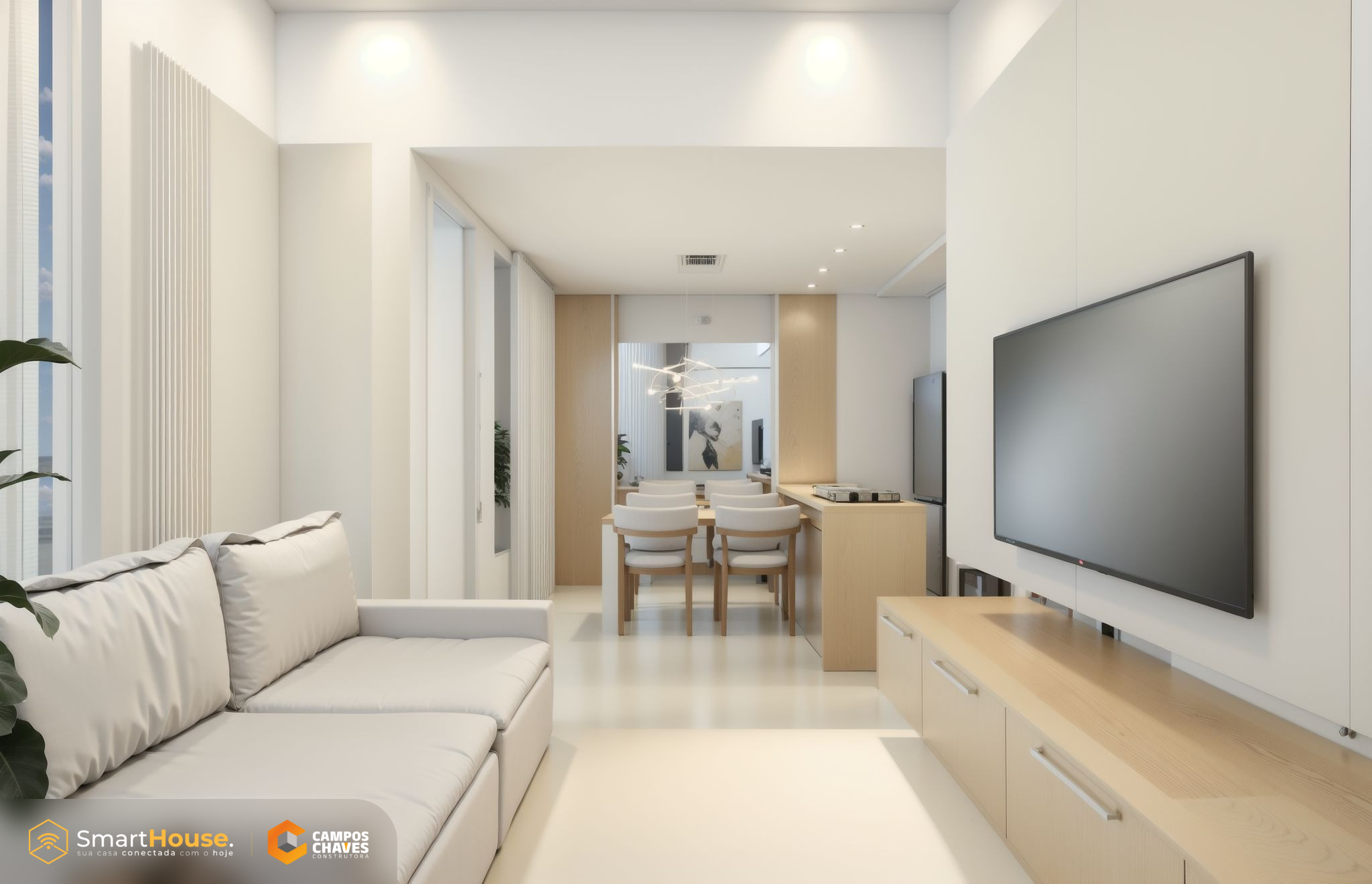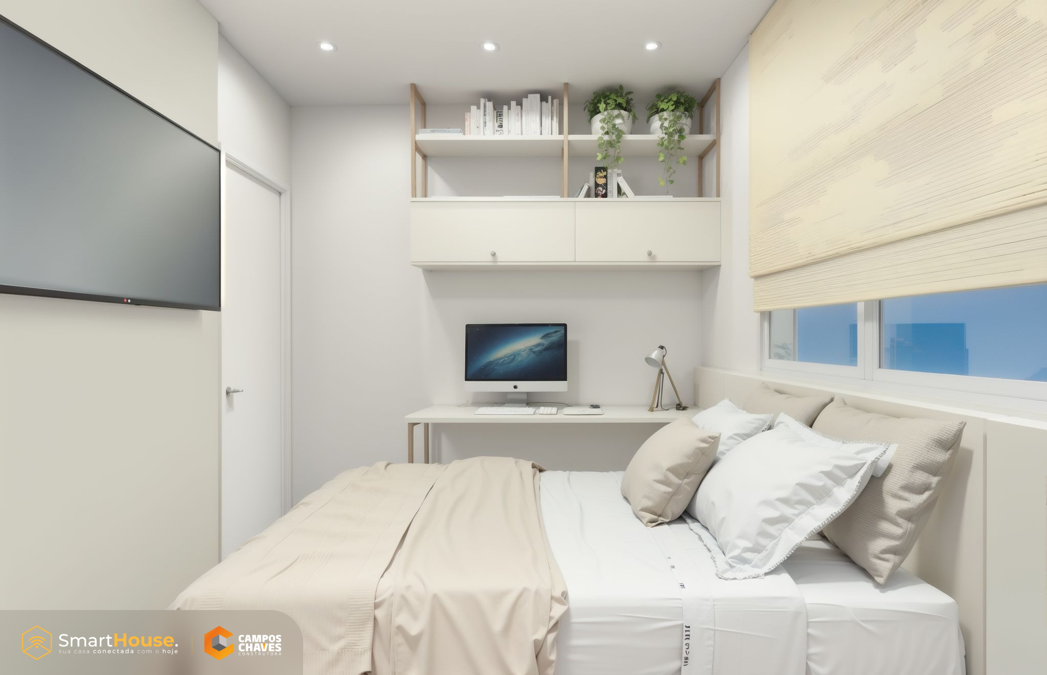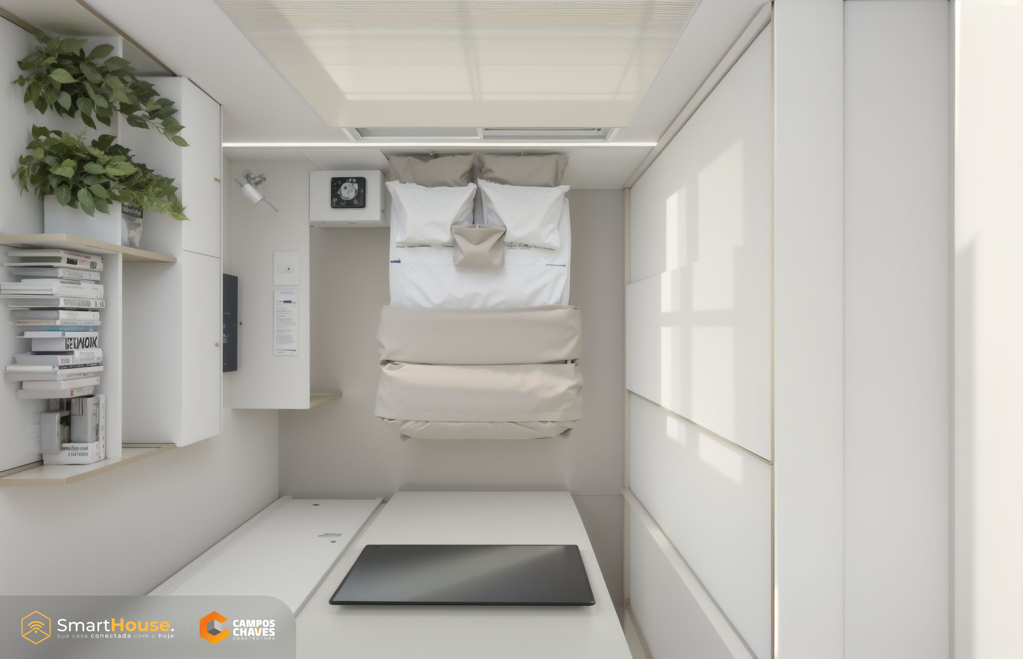 A Smart House vem com equipada luzes e interruptores com wifi, assistência virtual, alarme, aspirador robô e esperas para instalação de energia fotovoltaica.