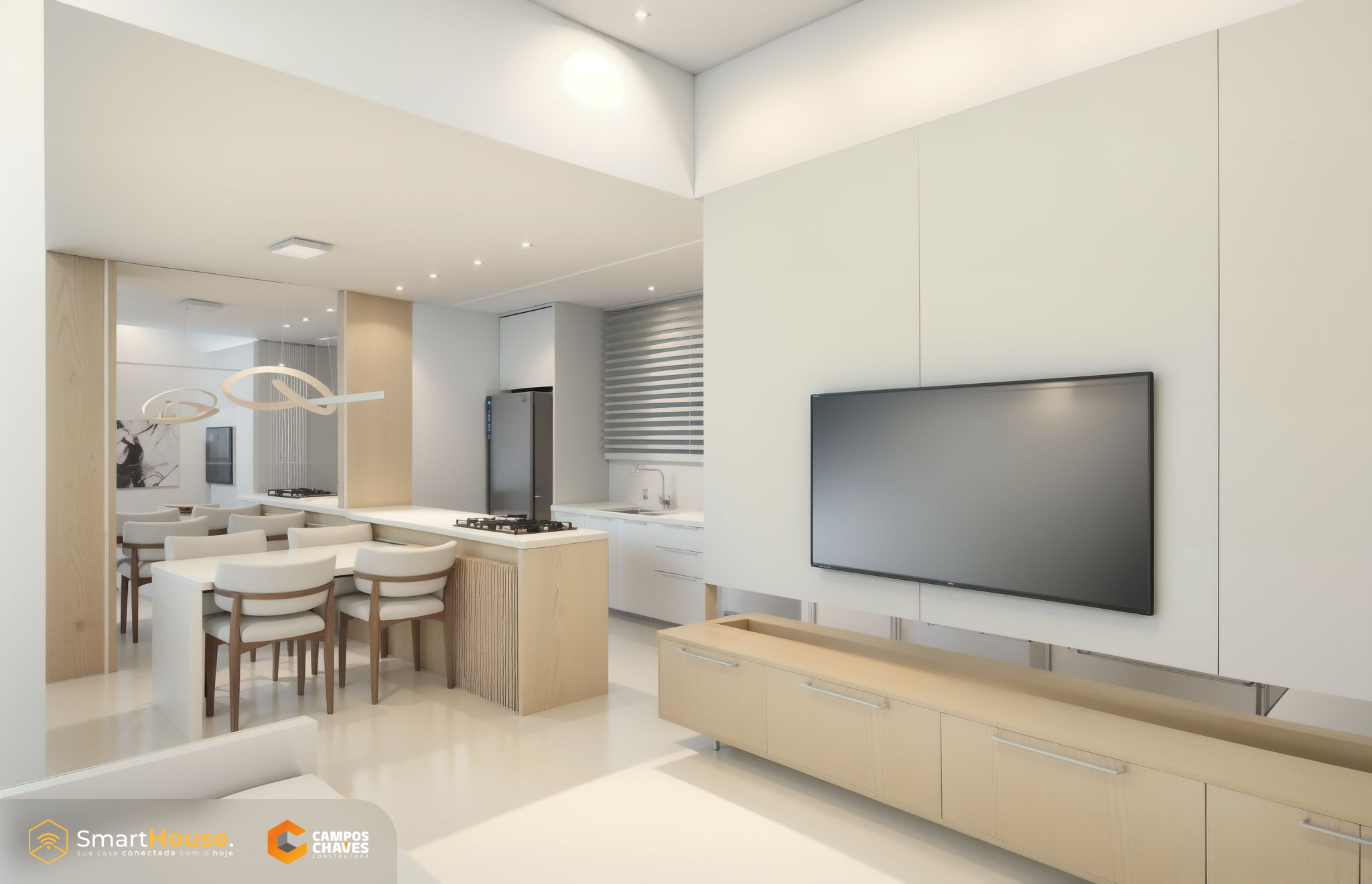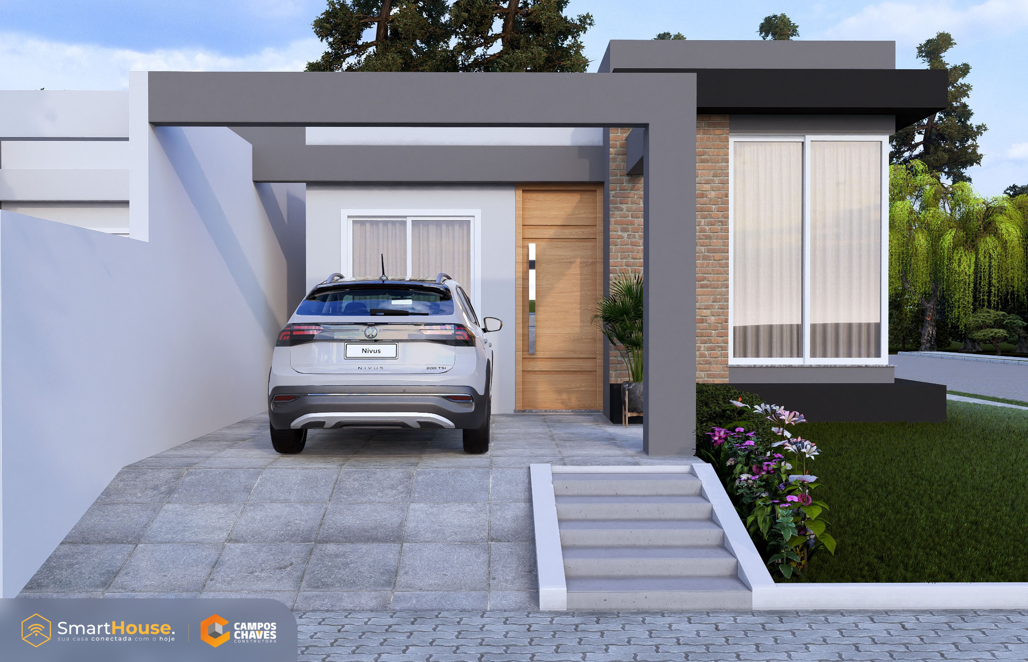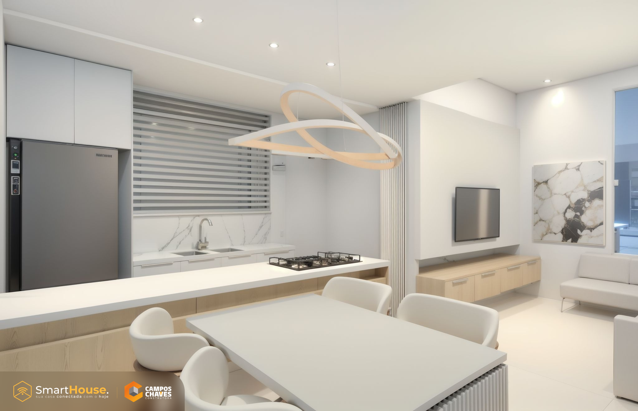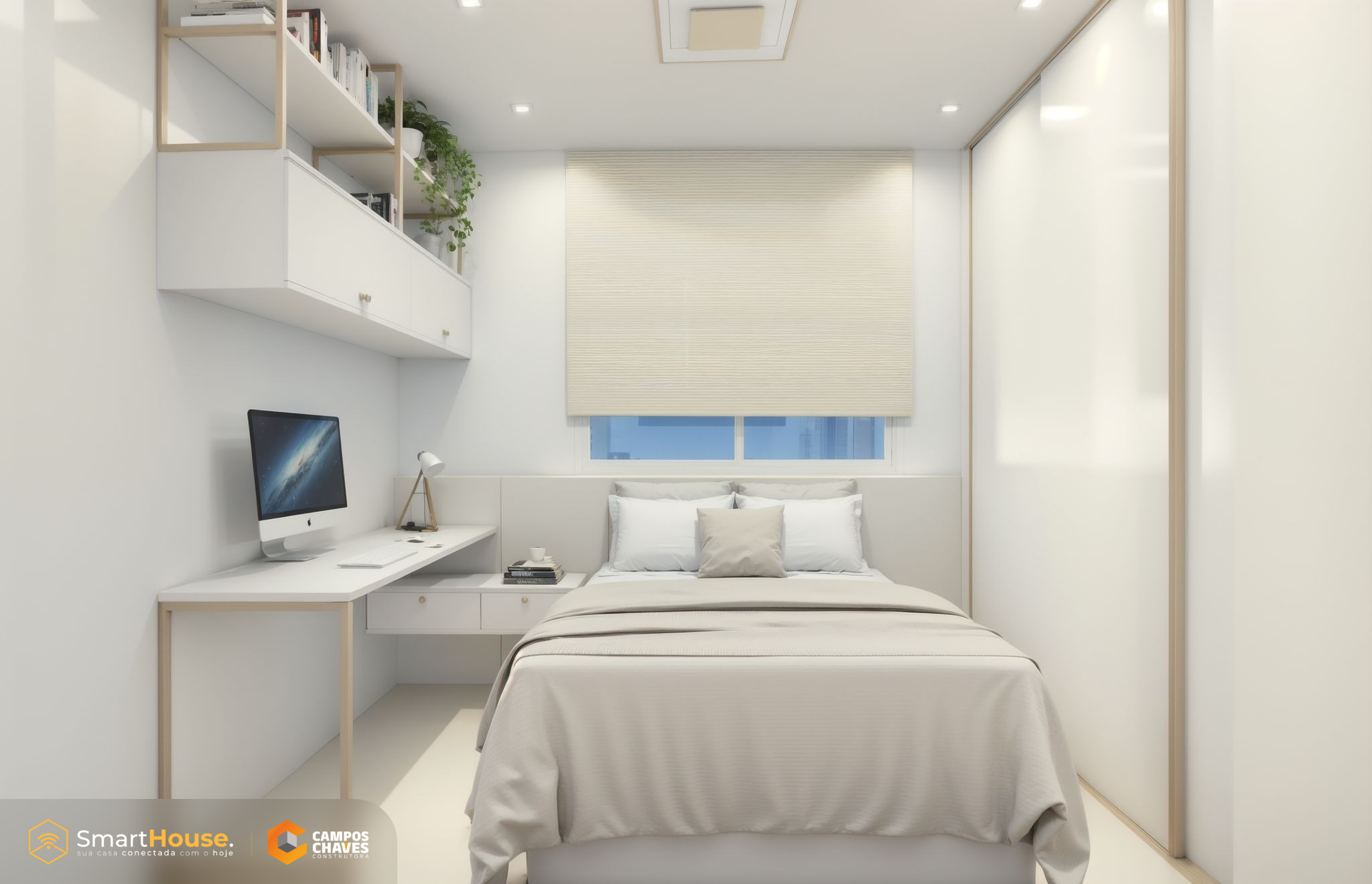 A Smart House vem com equipada luzes e interruptores com wifi, assistência virtual, alarme, aspirador robô e esperas para instalação de energia fotovoltaica.