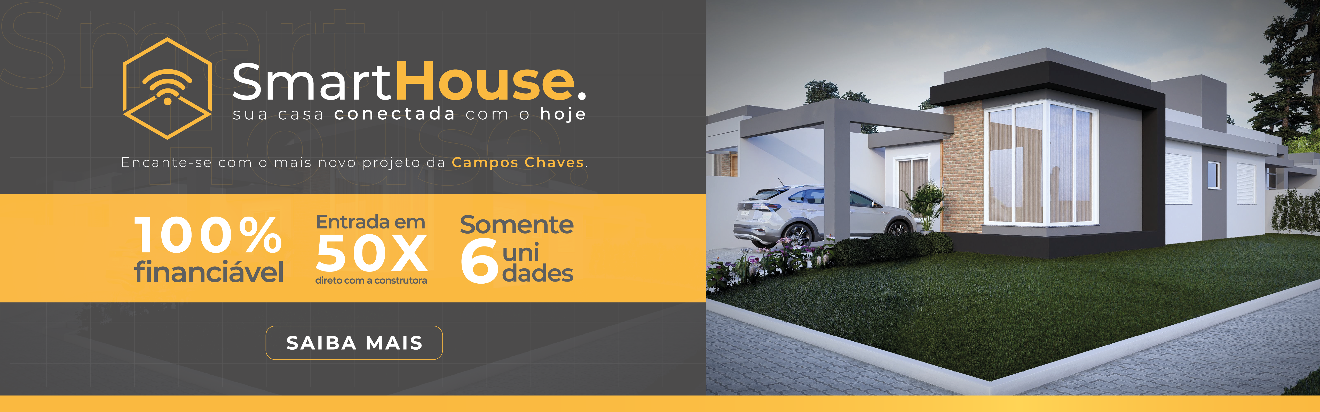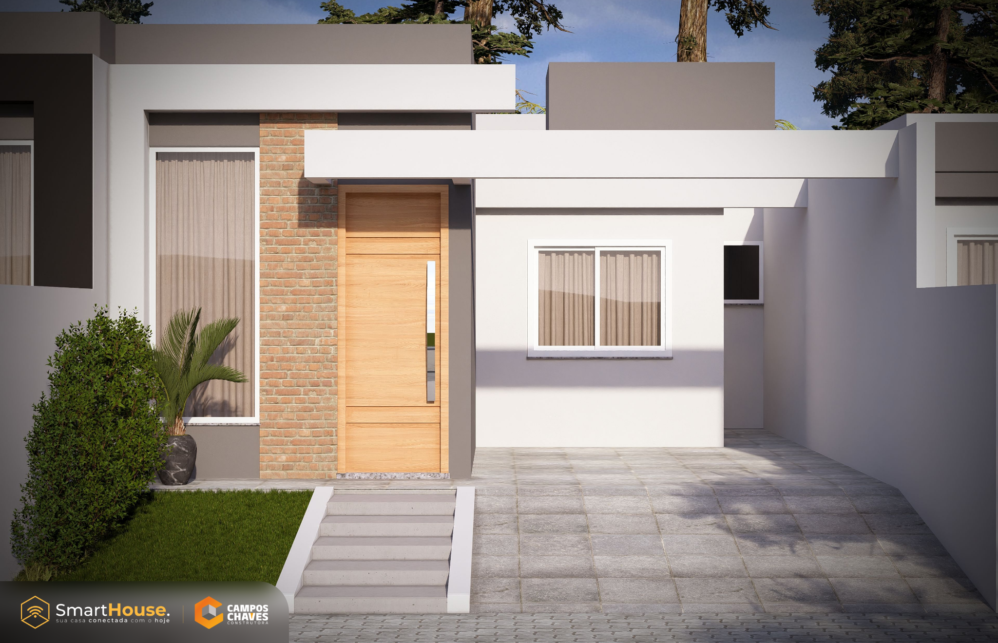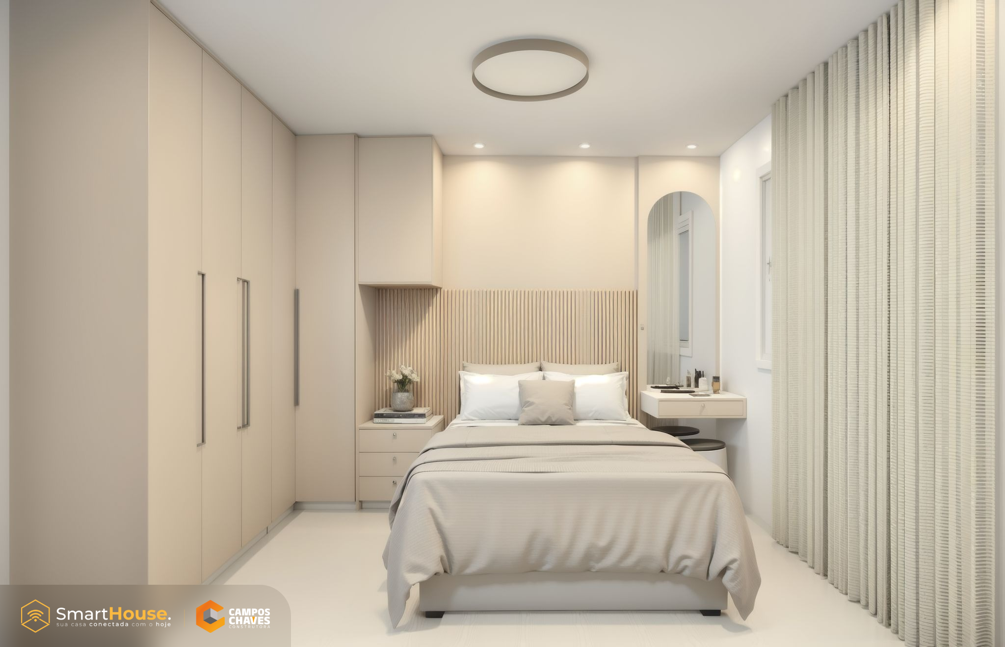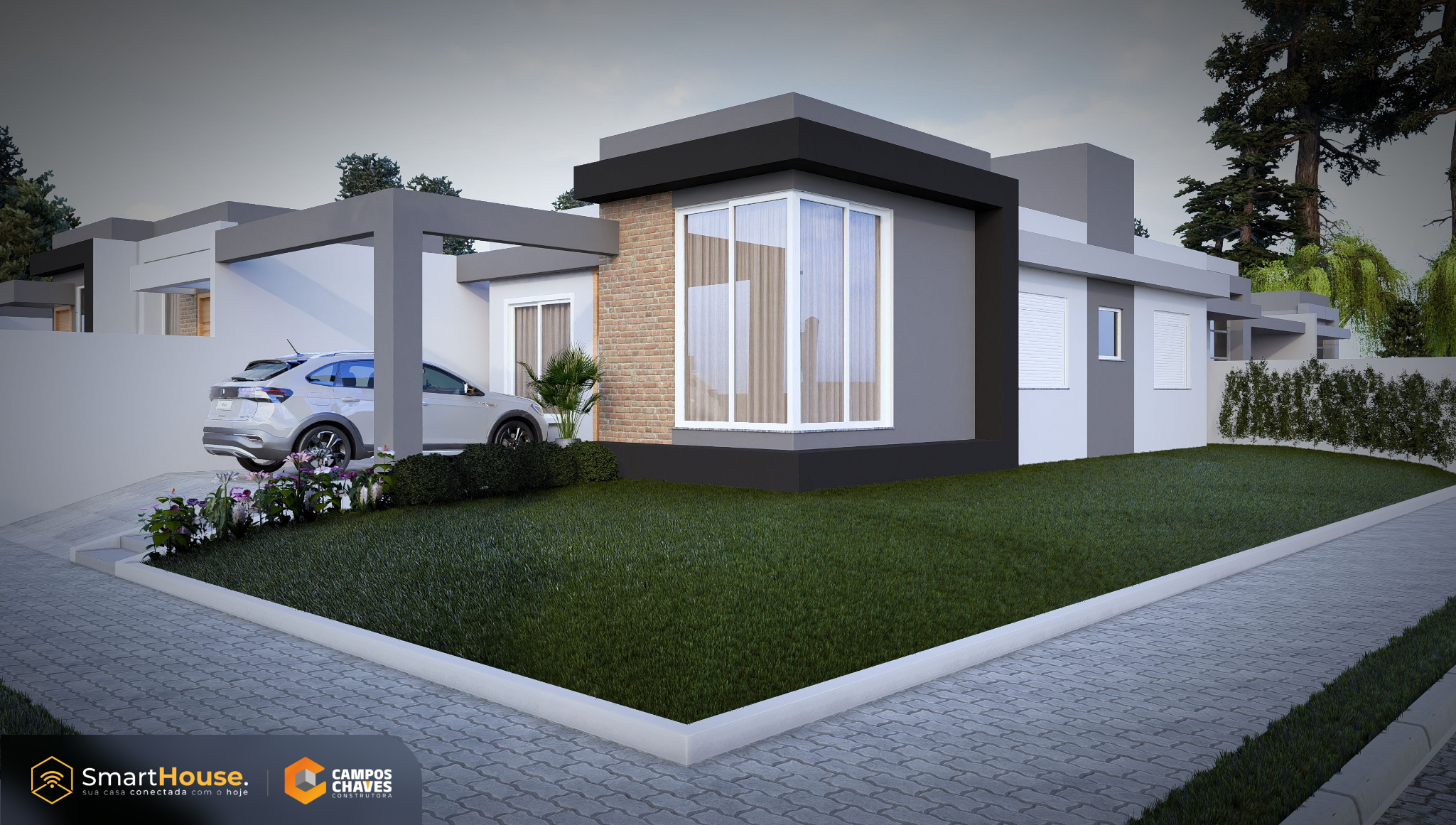 A Smart House vem com equipada luzes e interruptores com wifi, assistência virtual, alarme, aspirador robô e esperas para instalação de energia fotovoltaica.